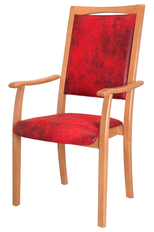 Der moderne Objektstuhl für das Seniorenheim besitzt bequeme Armlehnen und wartet mit hervorragenden Sitzeigenschaften auf. Das ergonomisch geformte Rückenteil ist mit 20 Millimeter dickem und FCKW-freiem Schaum gepolstert. Auch der selbstfedernde Sitz - ein Formteil aus mehrfach verleimtem Buchensperrholz mit Sitzmulde und Knierolle - hat eine angenehme 35 Millimeter dicke Polsterung.