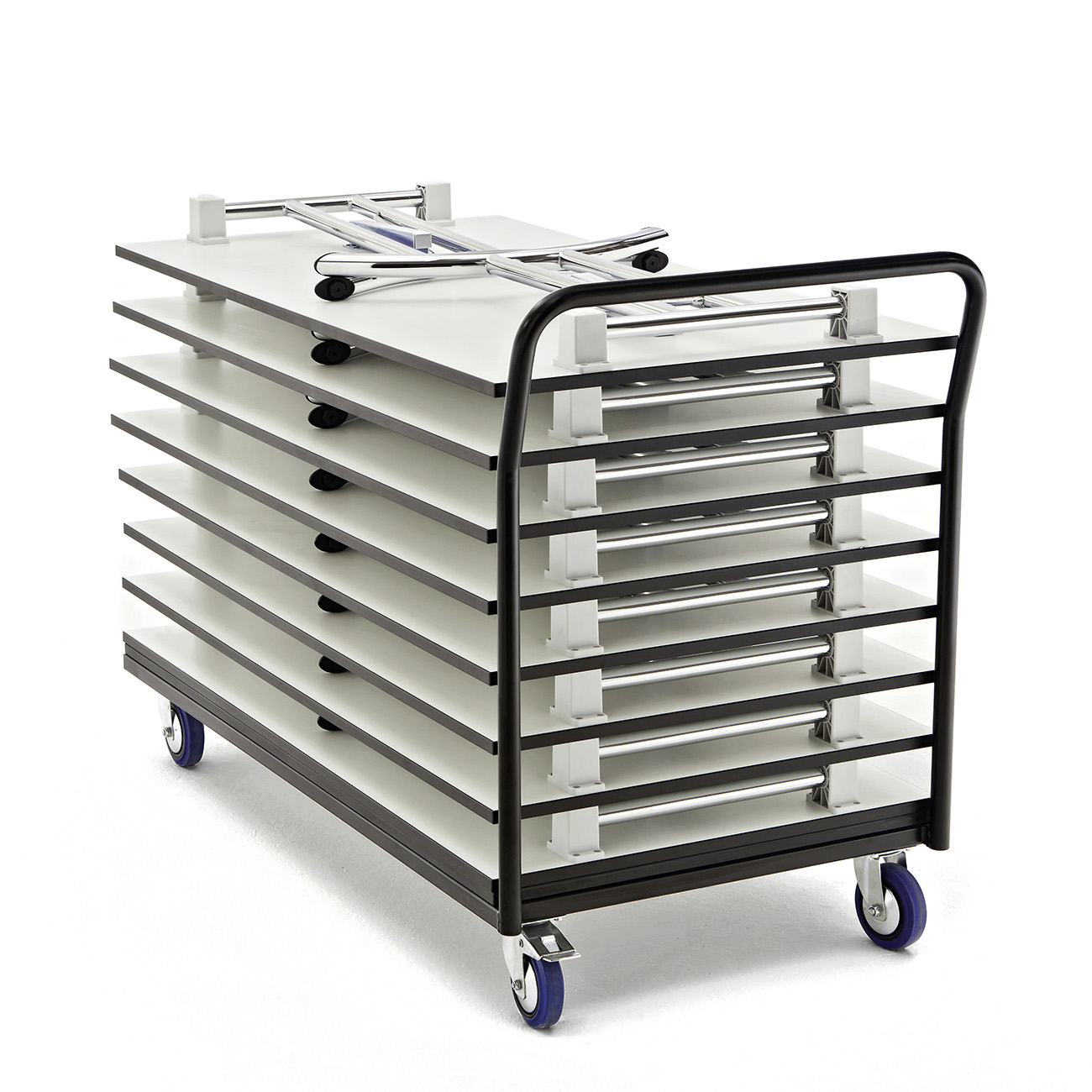 Dieser Klapptischtransportwagen ist für den liegenden Transport von max. 10 Klapptischen.