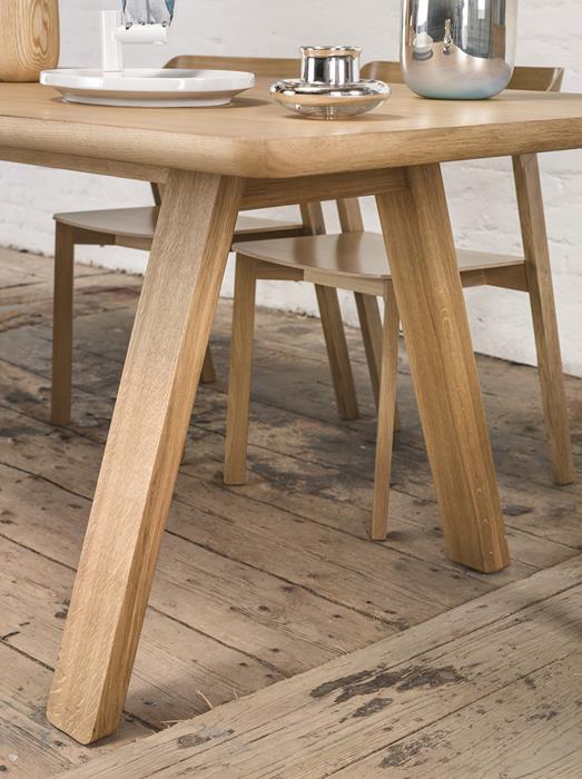 Ein geräumiger Tisch mit massiven Beinen, abgerundeten Kanten und zeitlosem Design. Durch das Fehlen des Spanholzes unter der Furnierplatte können nicht nur ein Stuhl, sondern auch Sesseln mit Armlehnen problemlos eingeschoben werden.