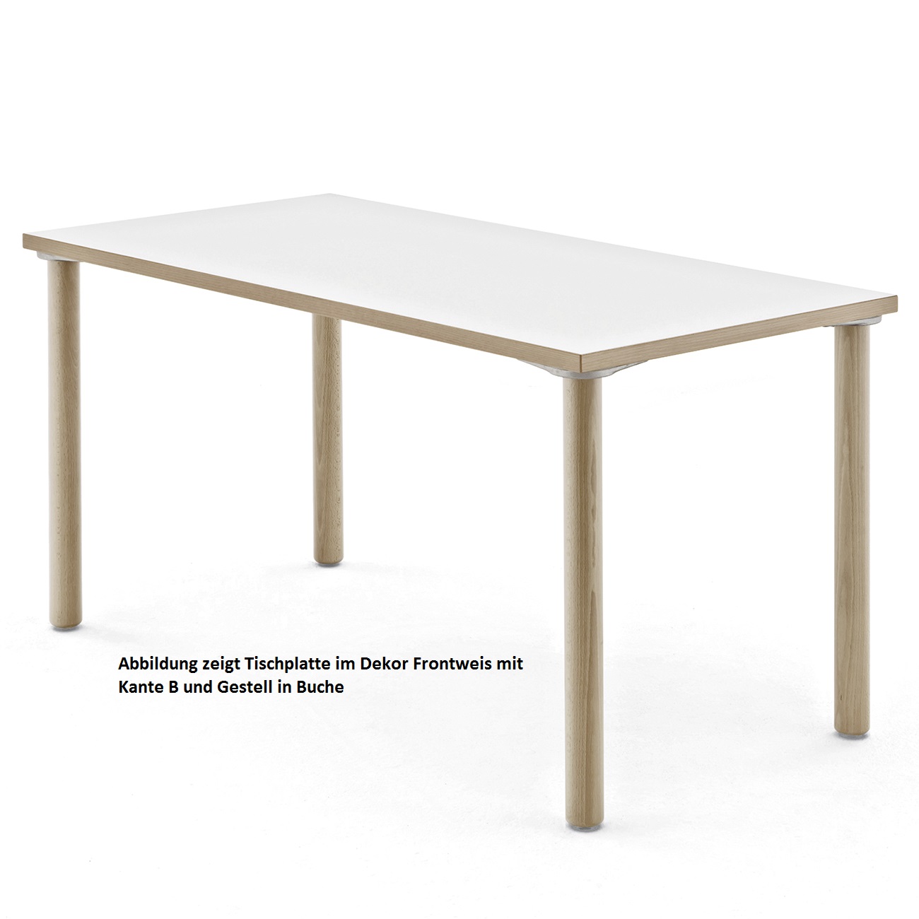 Rechtecktisch mit Gestell aus Buchenmassivholz, Rundprofil Ø 60 mm, AluDruckguss-Beschlag, eckständig montiert, Holzteile natur lackiert, Tischplatten mit ABS oder Massivholzkante