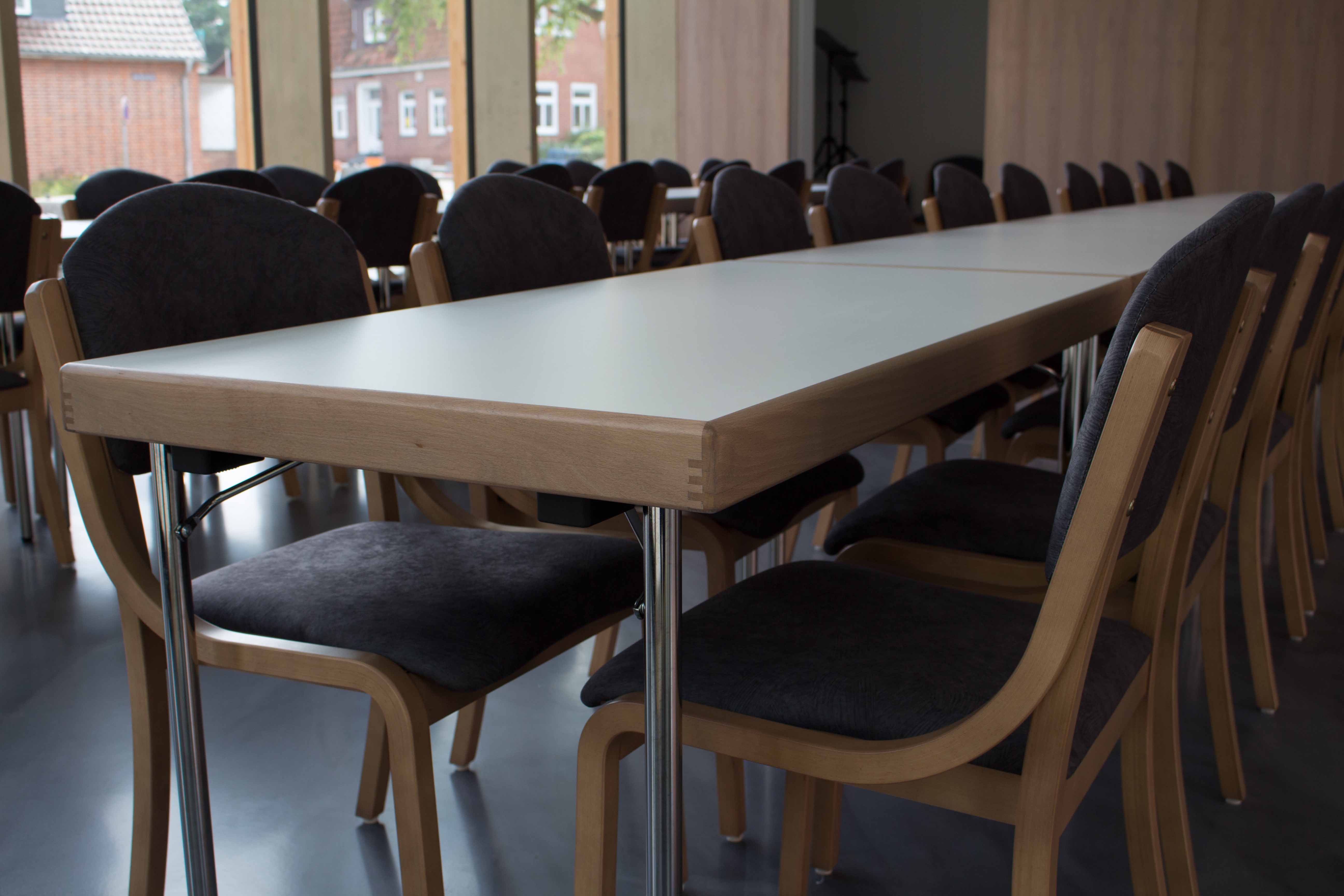 Klapptisch, Gestell 4-Fuß aus Stahl-Rundrohr Ø 30 x 1,5 mm, verchromt, mit Höhenausgleichverchromt, Tischplatten HPL Schichtstoff mit Massivholzkante oder Massivholzrahmen.