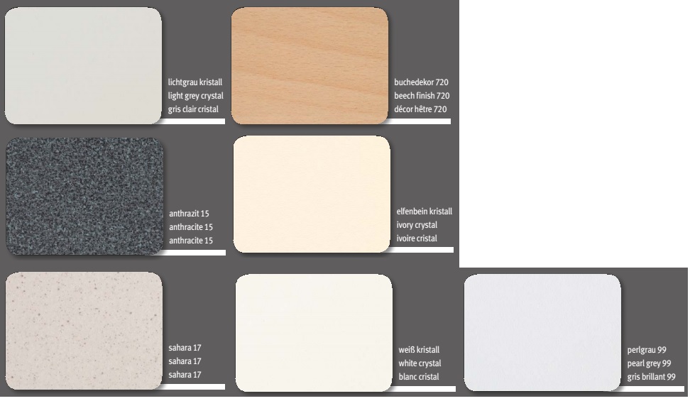 Plattenoberfläche: Schichtstoff 30mm Kante: 3mm ABS Anleimer oder massiv Einleimer Gestell: 3-säulig schwarz beschichtet Stahlsäulen: ø 76mm Tischhöhe: 74cm