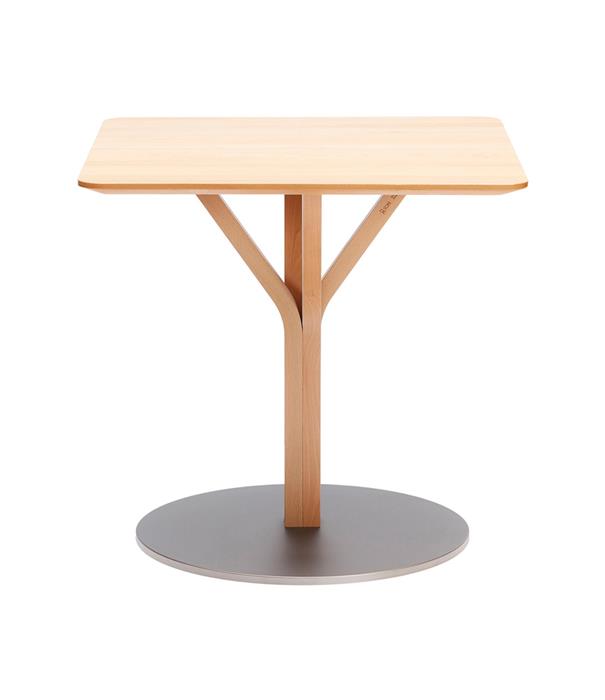Zur Anwendung kommen diese Tische sowohl im privaten Wohnbereich als auch in Restaurants und Bars. Die Oberplatte ist aus Massivholz und quadratisch. Das Gestell bilden vier gebogene Kanthölzer, die sich unter der massiven Platte spalten.