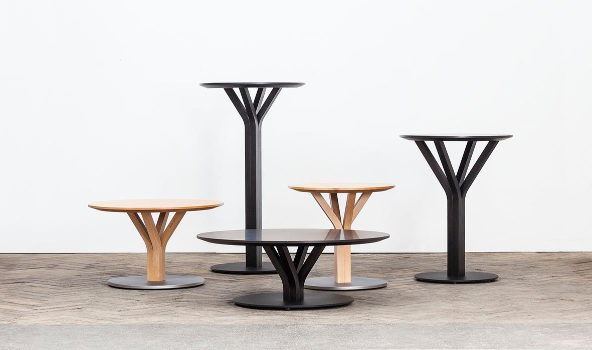 Zur Anwendung kommen diese Tische sowohl im privaten Wohnbereich als auch in Restaurants und Bars. Die Oberplatte ist aus Massivholz und rund. Das Gestell bilden vier gebogene Kanthölzer, die sich unter der massiven Platte spalten.